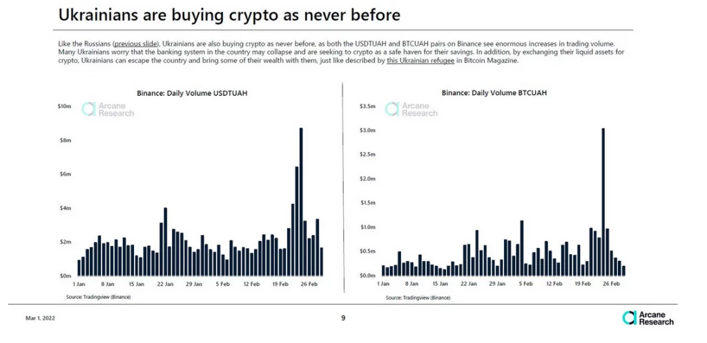 Daily Tether (USDT) stablecoin purchases on Binance via the Ukrainian hryvnia (UAH) jumped from around $2.5 million on Feb. 24 to around $8.5 million on Feb. 25 as the full-scale Russian invasion began. The BTC/UAH chart followed a similar path, rising from roughly $1 million to $3.0 million in the same period.