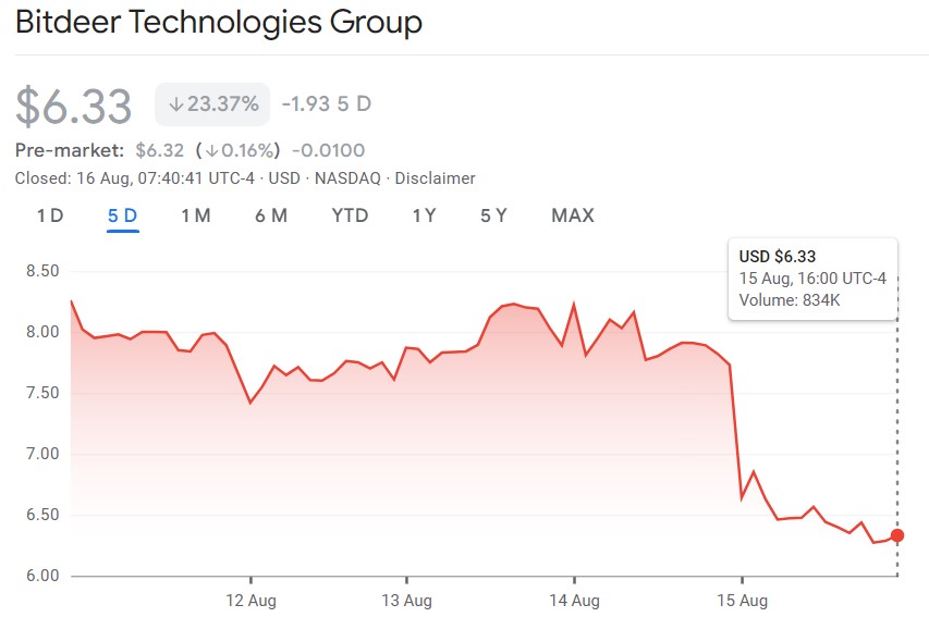 The company's 5-day chart shows a significant 23% price dump, with the price dropping from $8.26 on August 9 to $6.33 at the time of writing. Bitdeer is not the only mining company to see a decline in its stock price following the announcement of a convertible note issuance, as other companies have.