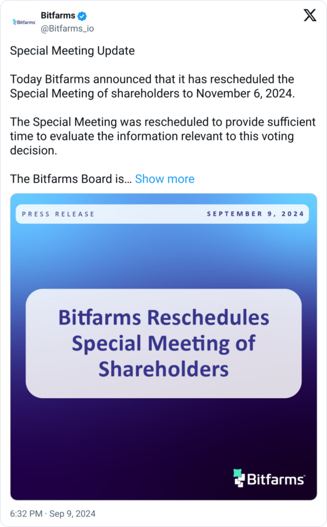 In response to Riot Platforms, the company's largest shareholder, Bitfarms has rescheduled its October shareholders “special meeting” to November 6.