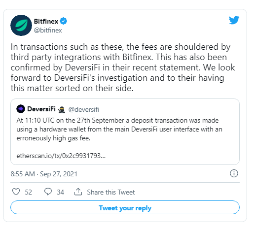 “In transactions such as these, the costs are shouldered through third-party integrations with Bitfinex,” Bitfinex responded on Twitter “implying that the fee will not be borne directly by the exchange.