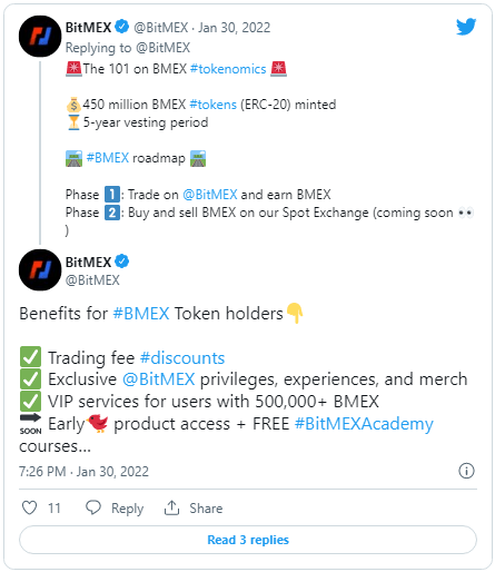 The Ethereum-based tokens have a maximum quantity of 450 million and are locked in a 5-year vesting contract. These will be used to reward new and existing BitMEX customers, as well as provide them with trading fee discounts.