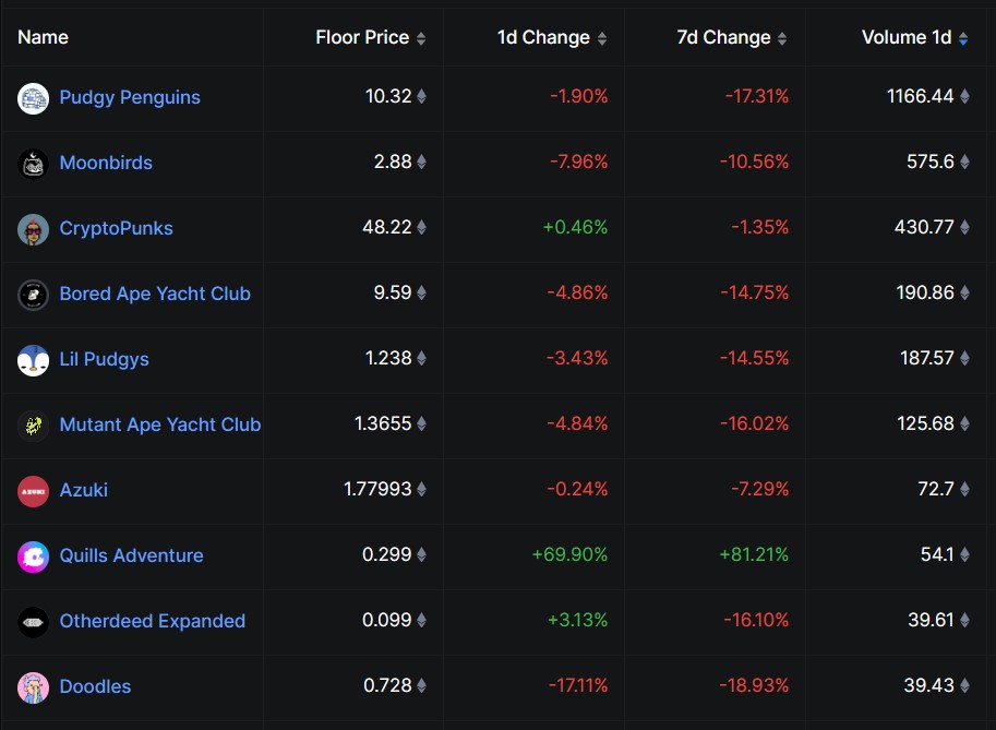 According to data from DefiLlama, floor prices for the leading NFT projects have fallen sharply over the past seven days. Pudgy Penguins, the market leader by trading volume, shed 17.3% to 10.32 ETH. BAYC followed with a 14.7% drop to 9.59 ETH, while Doodles suffered one of the steepest corrections, plunging 18.9% to 0.73 ETH. Other well-known collections such as Moonbirds and Lil Pudgys also took heavy hits, falling 10.5% and 14.6%, respectively.