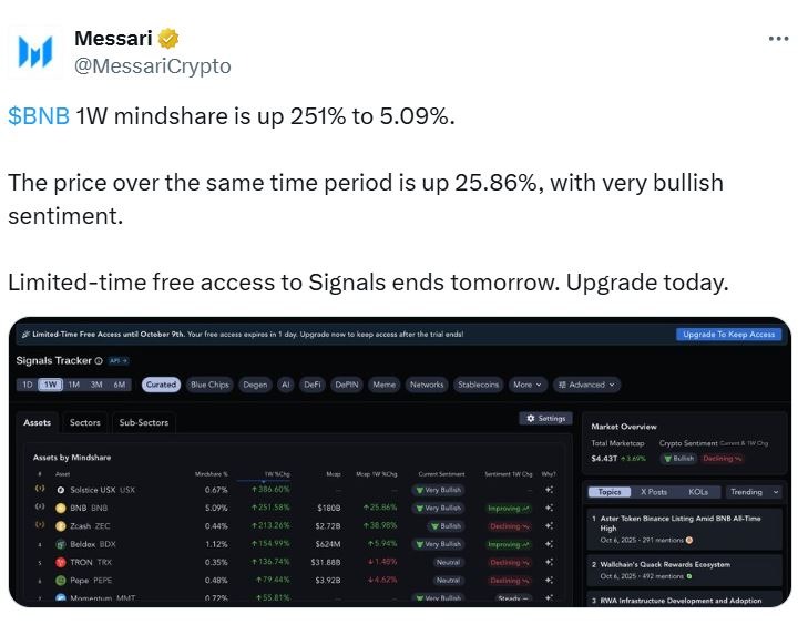 According to Messari data, BNB mindshare, a metric tracking public attention and discussion, rose from 1.45% to 5.09% in a week, marking one of the steepest sentiment jumps among top cryptocurrencies this quarter. The token’s price followed suit, rallying 27% to reach a new high of $1,330, according to CoinGecko.