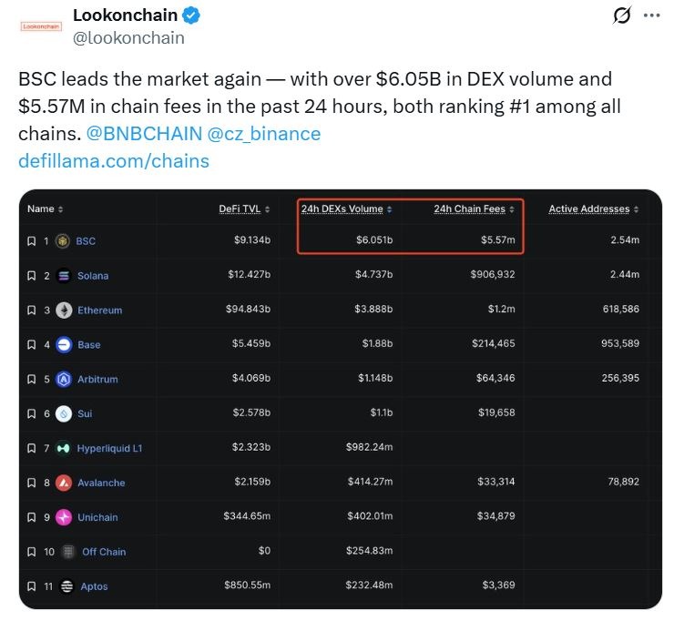 “Blockchain analytics platform Lookonchain reported that BNB Chain led all networks in decentralized exchange (DEX) volume last week, hitting $6 billion in trades and $5.5 million in chain fees, two key drivers behind the BNB mindshare spike.