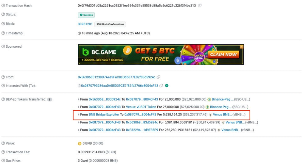 According to blockchain security firm PeckShield, a crypto wallet linked to the exploit had collateral worth more than $53 million liquidated on the crypto lending platform Venus Protocol on August 18. The perpetrator reportedly used the tokens as collateral for a 30 million Tether protocol loan.