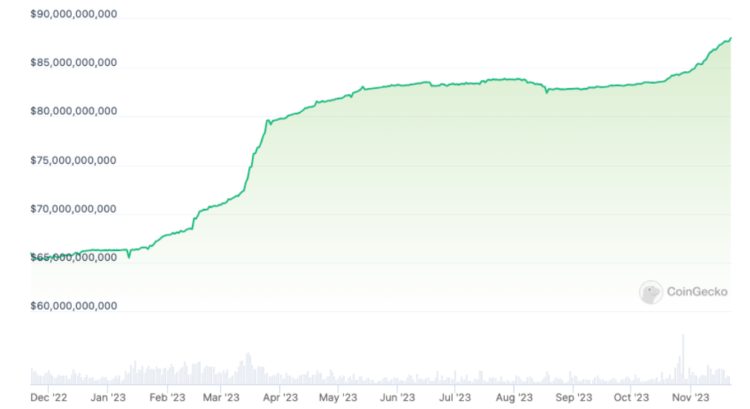 According to data provided by CoinGecko, the market capitalization of Tether's stablecoin is approaching $90 billion as it has progressively gained traction. The value of USDT reached an all-time peak of $88 billion on November 20, representing a 33% increase since the start of 2023.