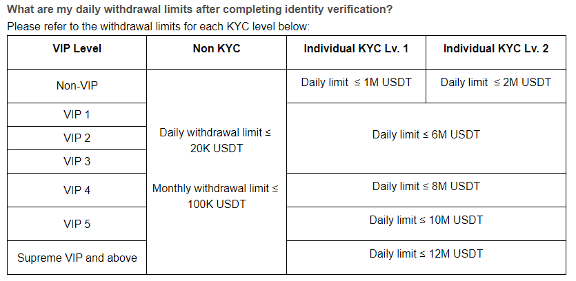 Depending on their degree of VIP status, users that successfully completed level one KYC on Bybit could have a withdrawal limit between 1 million USDT and 12 million USDT. According to Bybit: