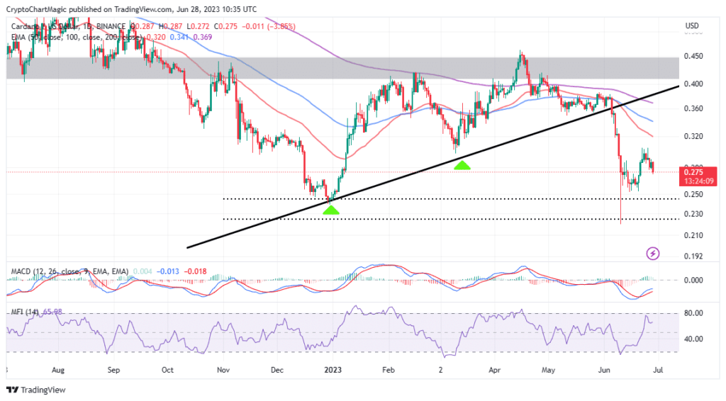 As anticipated, such occurrences tend to cause market instability, with the Cardano price declining from above $0.45 at the end of May to $0.22 on June 10. Despite the numerous attempts at recovery over the past two weeks, sustaining the trend reversal above $0.30 has become increasingly challenging. ADA is trading at $0.275 on Wednesday as the risk of further losses to $0.22 increases.