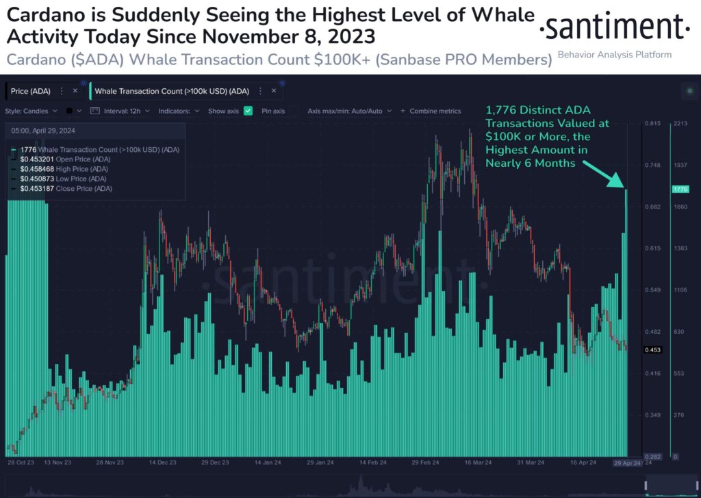 Santiment, an on-chain data provider, has discovered that transactions involving substantial quantities of Cardano (ADA) tokens exceeding $100,000 in value have reached their peak since November 8th.
