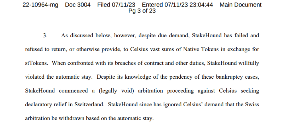 According to Celsius, StakeHound's arbitration petition violates United States Bankruptcy Code section 362, also known as the “automatic stay” rule. This rule prohibits creditors from taking legal action against or retrieving debt from a business or individual who has filed for bankruptcy.