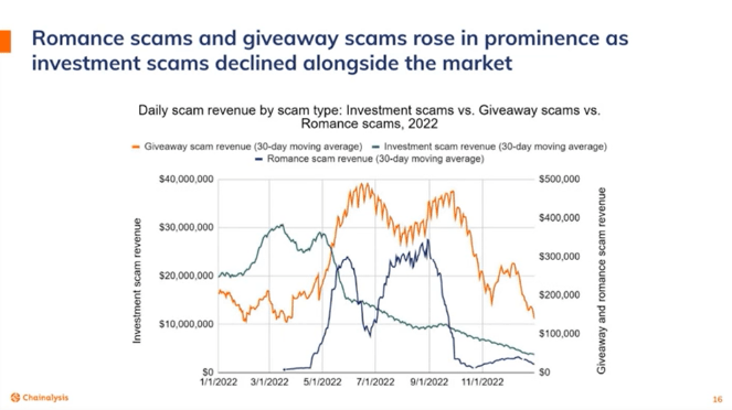 While the collapse of Terra in 2022 made crypto investors hesitant to participate, scammers resorted to new tactics, such as preying on greed with free giveaway scams and playing with people's emotions with love scams. Jardine explained that: