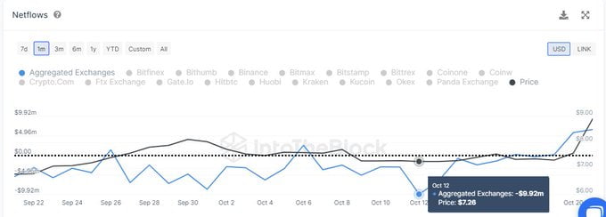 Felix also implied that significant investor accumulation may have contributed to this price increase. At approximately $7.26, roughly $9.92 million worth of LINK tokens were transferred from exchanges to accounts. Since then, LINK has increased by more than 50 percent.