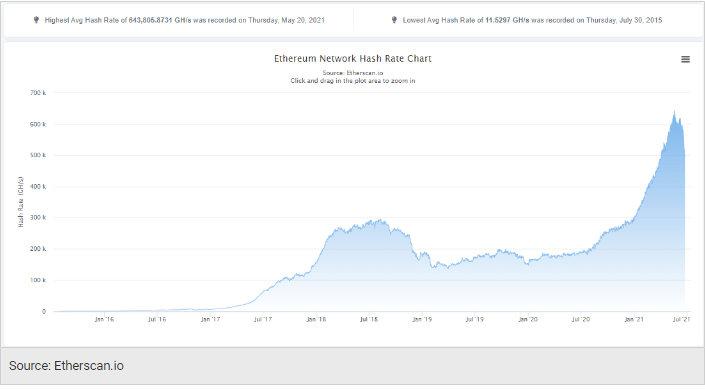 The mining hashrate for Ethereum has been continuously increasing since December 2019, as shown in the graph above.