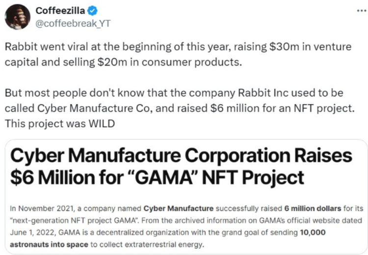 Discoveries published a video on the Coffeezilla channel on May 21 that exposed the participation of Rabbit AI in NFTs. Cyber Manufacture Co. was the organization's previous name, and it raised $6 million for the NFT project Gama, according to the YouTube investigator.