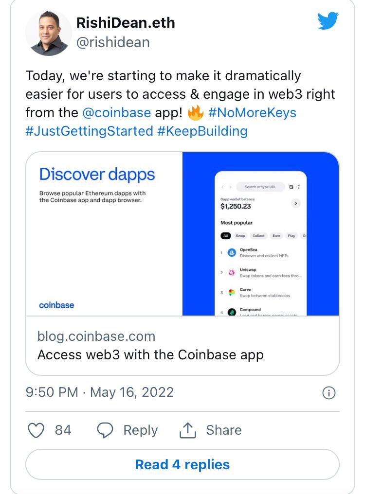 Rishi Dean, Coinbase's Director of Product Management, announced on May 17 that eligible users would be able to start trading on nonfungible tokens (NFT) marketplaces, making swaps on decentralized exchanges (DEX), and interacting with decentralized finance (DeFi) lending protocols to borrow and lend funds.