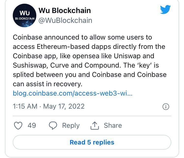 According to Dean, sharing custody of the keys is a security feature intended to protect users from device-related issues. “This means that if you lose access to your device, the key to your Dapp wallet remains safe, and Coinbase can assist in recovery through our live support,” he wrote.