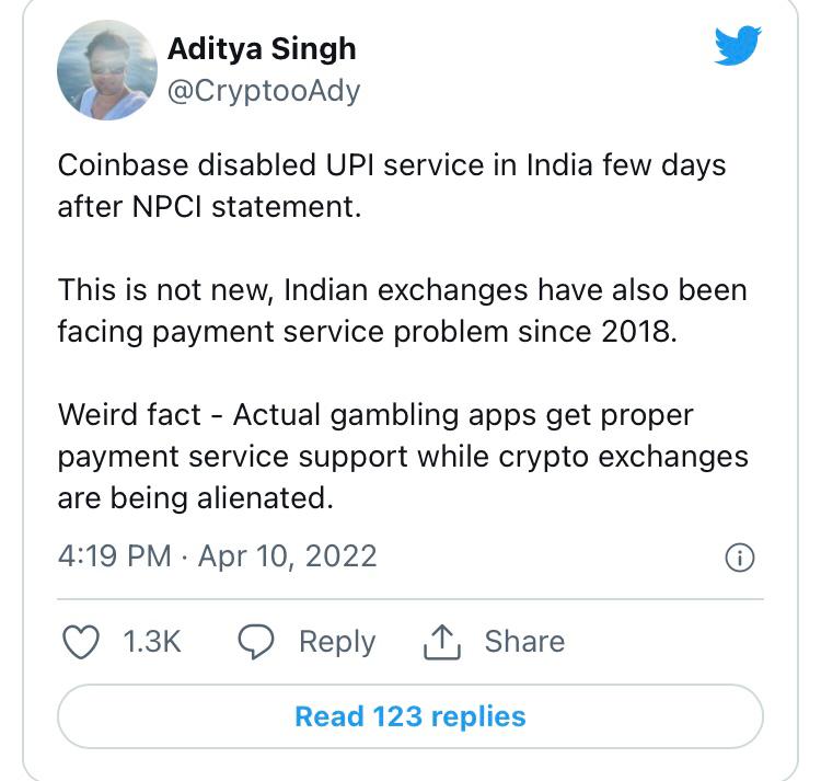 The abrupt interruption of service does not appear to have irritated Indian Coinbase users. Aditya Singh, the co-founder of the Crypto India YouTube channel, tweeted on April 11 to his 210,000 followers, “This is not new, Indian exchanges have also been suffering payment service problems since 2018.”