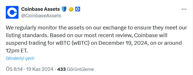 “We regularly monitor our assets to ensure they meet our listing standards. Based on our latest review, Coinbase will suspend trading for wBTC on December 19, 2024, around 12:00 PM ET. Your WBTC funds will remain accessible, and you will have the ability to withdraw them at any time.”