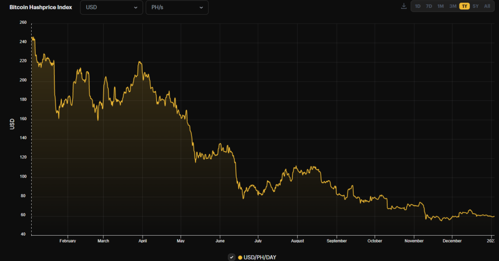 The cost of production has gone up for miners even if the value of Bitcoin has gone down, which has hurt their profits and caused the “hash price”—the amount of money miners can make for each unit of hash rate—to drop by almost 75% by 2022.