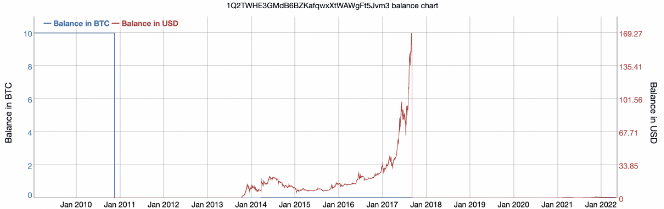 The 10 Bitcoin transaction's wallet address tells a story: the value of Bitcoin soared to 10 Bitcoin in 2009 (approximately $400,000 in today's values), but before Bitcoin had a dollar-denominated value.