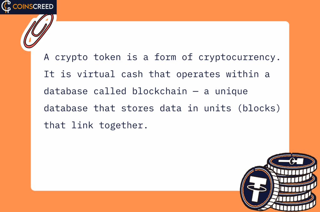 A crypto token is a cryptocurrency. This means it is virtual cash that operates within a database called blockchain — a unique space that stores data in units (blocks) that link.