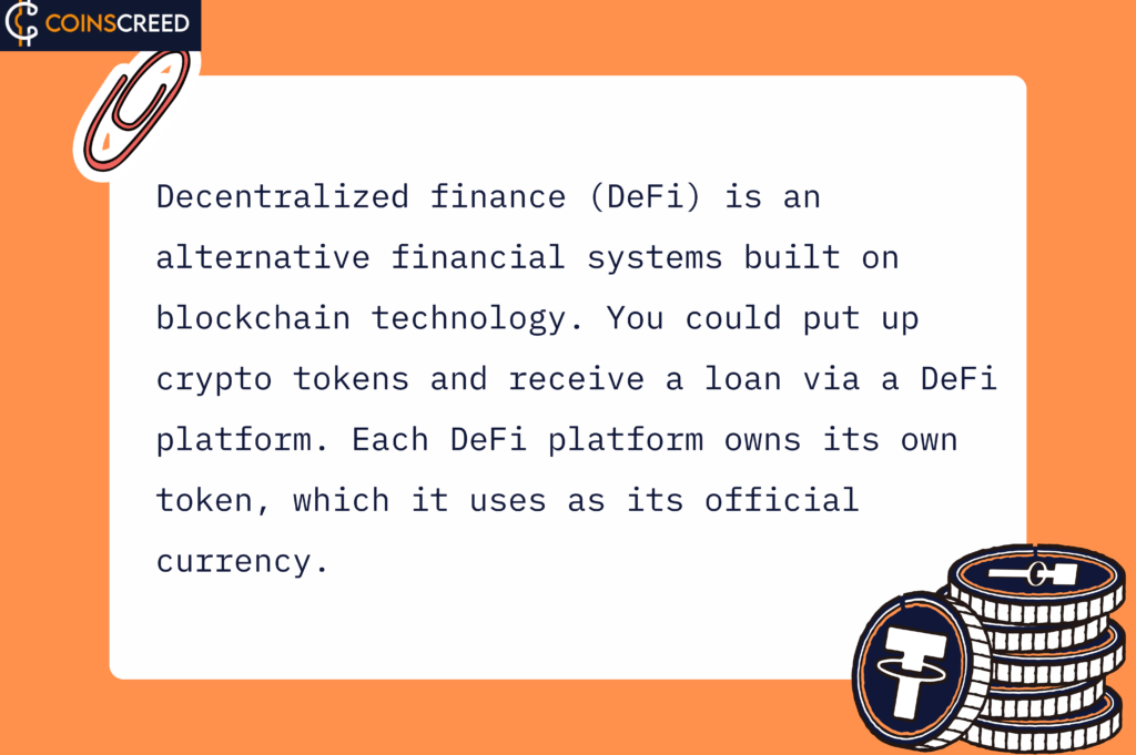 Decentralized finance (DeFi) refers to alternative financial systems built on blockchain technology. You could, for example, put up crypto tokens and receive a loan via a DeFi platform. Each DeFi platform owns its own token, which it uses as its official money.