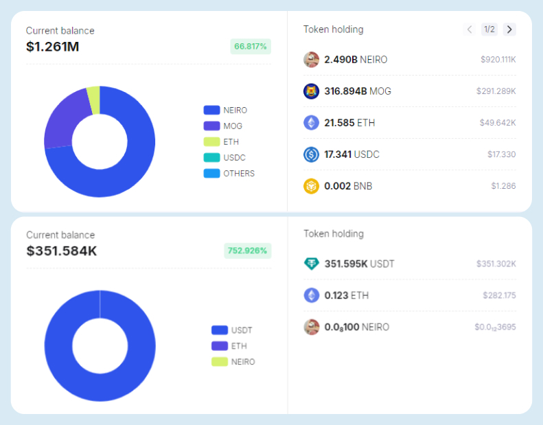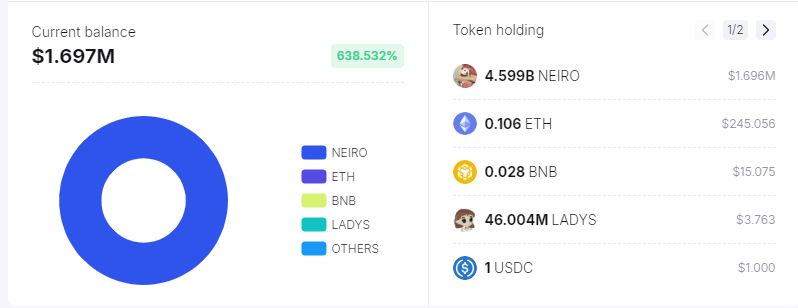 NEIRO holds the majority of the portion, along with other assets such as 316.894 billion MOG, 21.585 billion ETH, 17.341 billion USDC, 0.002 billion BNB, and so on. He possesses 2.490 billion NEIRO, which is equivalent to $913,786,000.