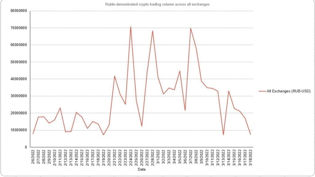 According to data from Chainalysis, daily rubble-denominated crypto trade volume was barely $7.4 million on March 18, down more than 50% from recent records and a high of $70 million on March 7.