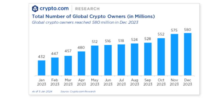 A crypto.com exchange report showed that at the end of 2023, more than half a billion individuals, approximately over 580M, owned cryptocurrencies.