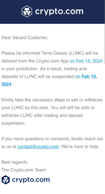 Several Terra Luna Classic community members expressed apprehension regarding emails circulated on February 15th, claiming that Crypto.com had delisted LUNC. The community speculated that the emails might have been phishing attempts that endangered consumers.