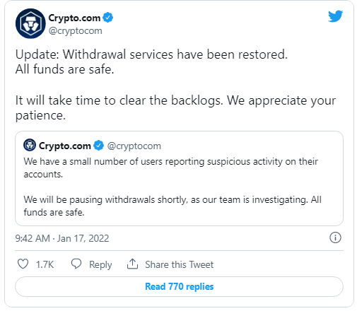 Crypto.com, a renowned crypto trading platform, has banned all deposits and withdrawals as of Monday, January 17, alleging “unauthorized behaviour” at some accounts. It has, however, reinstated some accounts and withdrawal services, indicating that the accounts are safe.