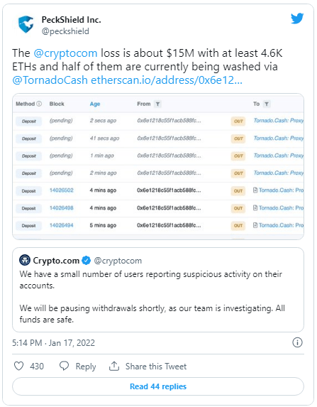 Several consumers reported on social media that their tens of thousands of dollars worth of digital assets had vanished from the exchange. Although Crypto.com claims that the accounts are safe, Peckshield, a blockchain security and data analytics organization, claims that the exchange has lost a whopping $15 million in the recent theft, or at least 4,600 ETH.