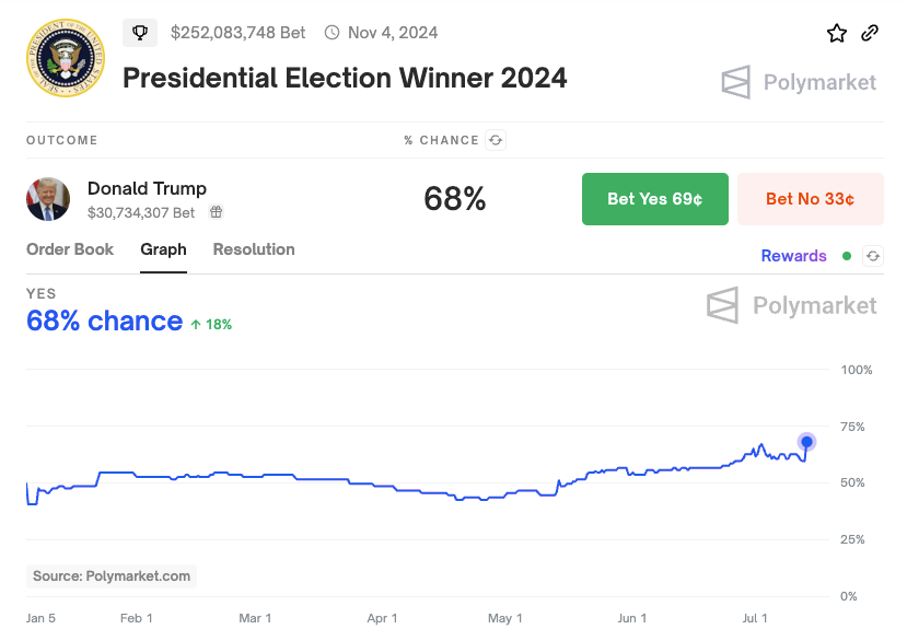In the immediate aftermath of the assassination attempt, the odds of Trump winning the upcoming election increased from 60% to 68%, according to data from the Ethereum-based prediction market Polymarket. Speculators were also quick to place their wagers.