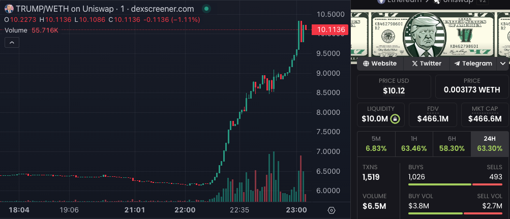 The MAGA memecoin (TRUMP), which is based on Ethereum, experienced a rapid increase in price from $6.31 to $10.36 immediately following the assassination attempt. This resulted in a total market capitalization increase from $293 million to $469 million in less than 45 minutes, according to DexScreener data.