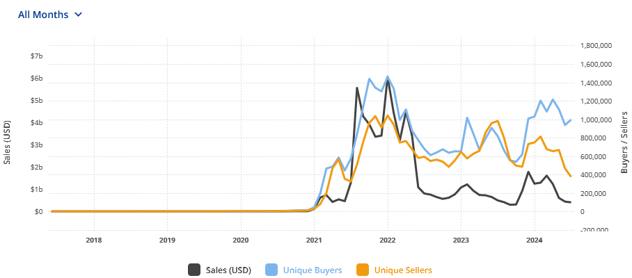 According to CryptoSlam's NFT data tracker, NFTs are expected to generate a combined $407.8 million in sales this month, the lowest monthly volume since November 2023.