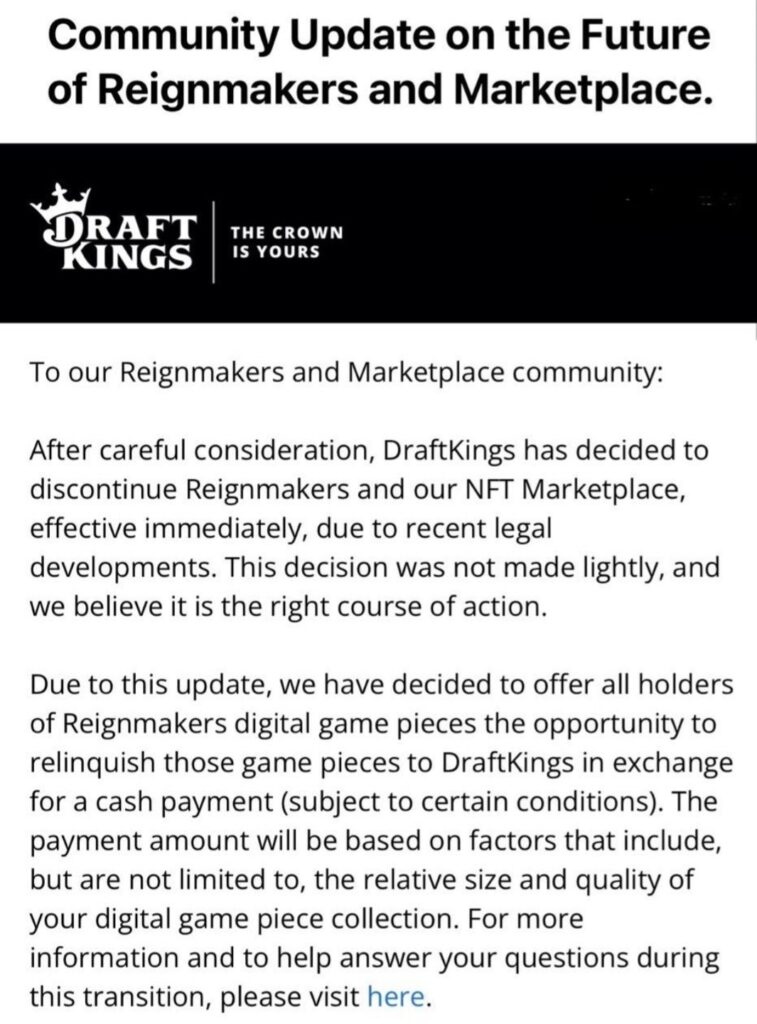 Due to recent legal developments, DraftKings has reportedly informed users in an email that Reignmakers and our NFT Marketplace will be discontinued immediately. This decision was made after careful consideration.