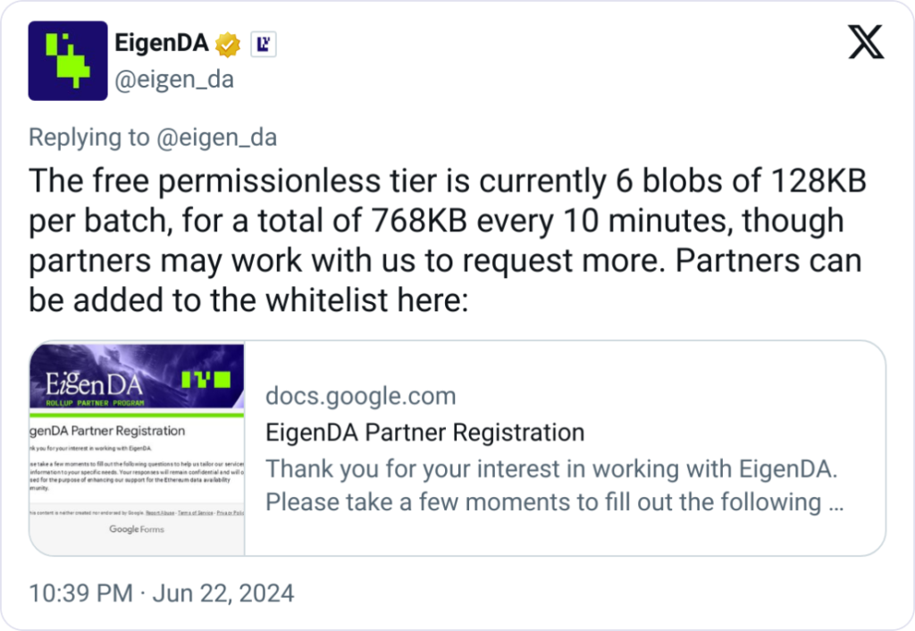 EigenLayer is also at work on the implementation of permissionless payments for blob transfer rates in EigenDA, which is scheduled for release by the end of 2024. This feature will enable users to allocate bandwidth at a fixed rate in order to accommodate high transmission rates.