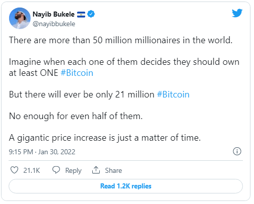 According to Nayib Bukele's recent Twitter feed, due to Bitcoin's capped supply of 21 million, a massive price hike is only a matter of time. He explains that the current Bitcoin supply of 21 million is insufficient to meet the needs of even half of the world's 50 million millionaires. This appears to imply that demand may outstrip supply, causing prices to rise.