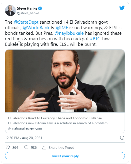 “The StateDept sanctioned 14 El Salvadoran govt officials, WorldBank & IMF issued warnings, & ELSL’s bonds tanked. But Pres. Nayib Bukele has ignored these red flags & marches on with his crackpot Bitcoin Law. Bukele is playing with fire. ELSL will be burnt.”