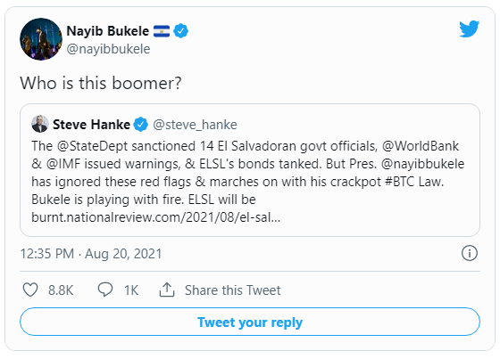 Bukele retweeted the economist's characterization of him as a “boomer.” President Bukele has received a lot of criticism from both the outside world and within the country.