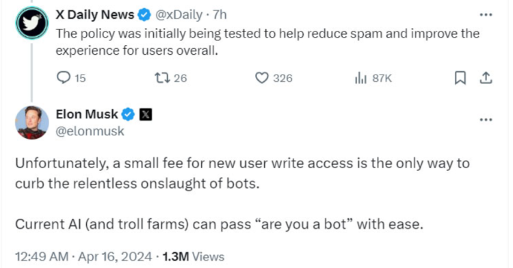 “Unfortunately, a small fee for new user write access is the only way to stem the relentless onslaught of bots,” X Daily News owner Elon Musk stated on April 15 in response to a post about testing a spam reduction policy.