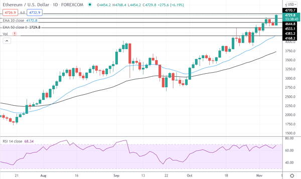 Ethereum's next resistance level has lately shown near $4,770. If Ethereum can stay above this level, it will be on its way to the psychologically significant $5,000 mark.