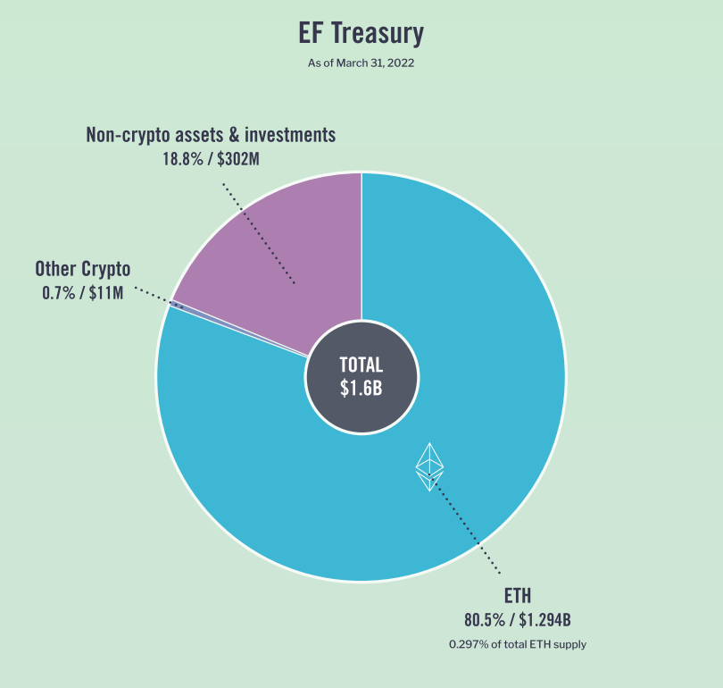 The Ethereum Foundation (EF) has released a report detailing how its $1.6 billion treasury is mostly made up of Ether (ETH), bu t it also includes a surprising 18.8 percent in non-crypto assets.