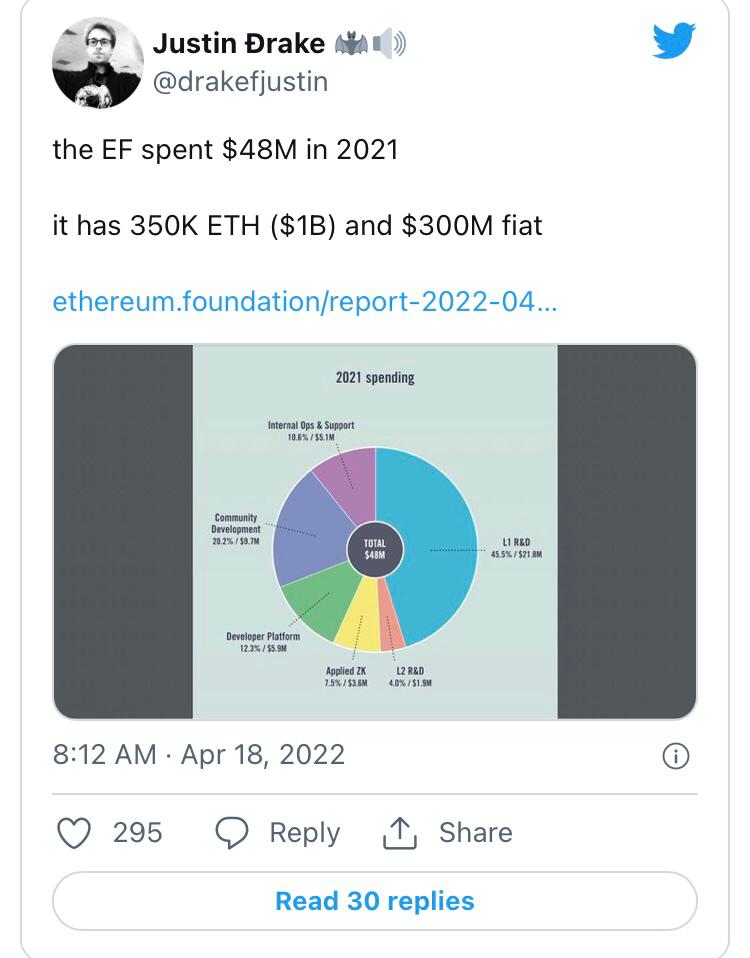 The Foundation's April 2022 report is the first to outline what it has in its treasury and how it is allocating expenditures, including grant funding for various Ethereum-based projects. Overall, the EF appears to be on the solid financial ground, having spent only $48 million in 2021.