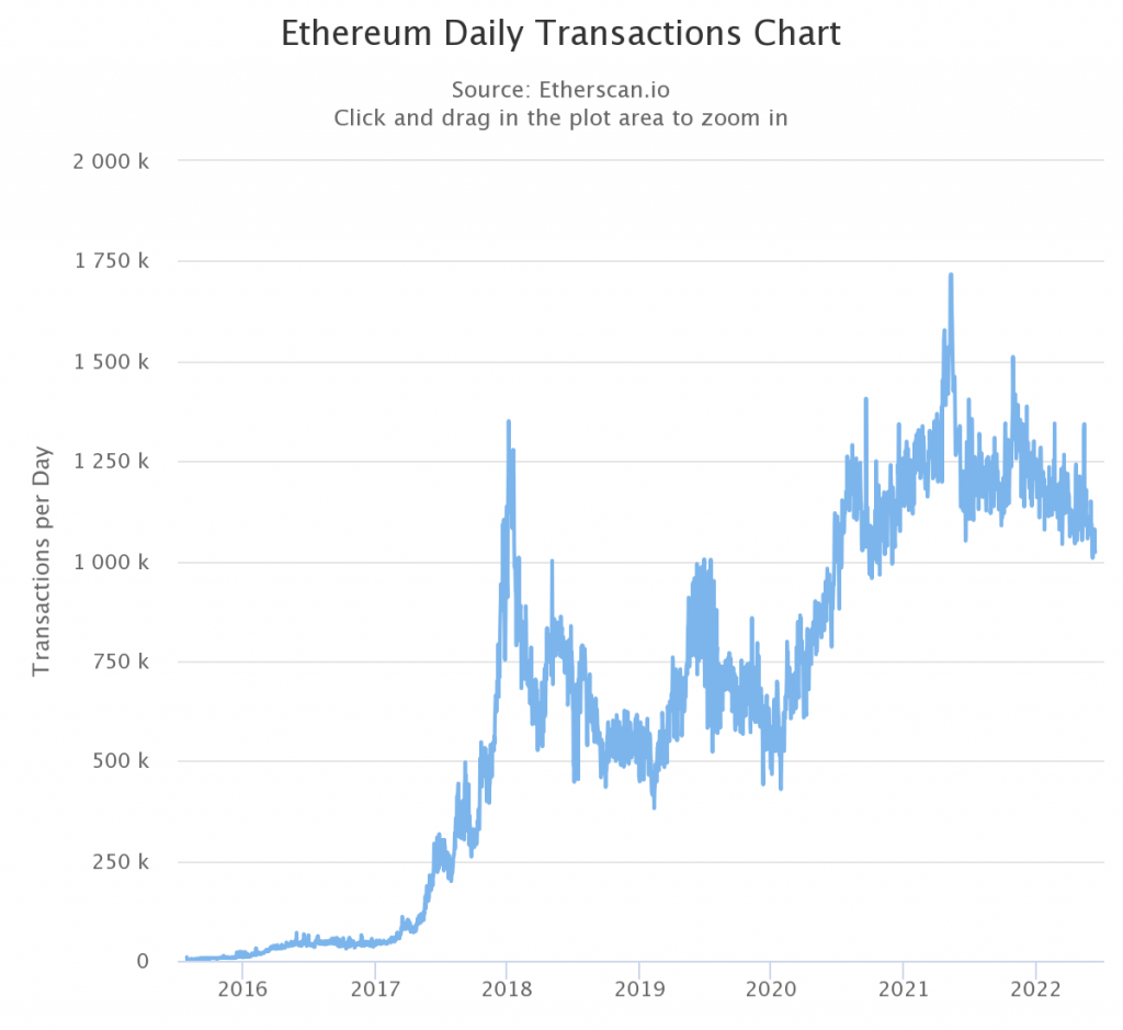 Despite the current bearish sentiment in the cryptocurrency markets, the Ethereum user base remains strong. Except for one day in December 2020, daily network transactions have remained above one million. Measuring daily transactions provides a clear and concise picture of the network's overall load.
