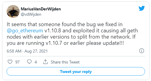 According to developer Marius van der Wijden, an attacker took use of a flaw found in previous versions of Geth, Ethereum's most popular software client, to cause older nodes to disconnect from the network.