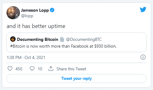 Not only is Bitcoin currently worth more than Facebook in aggregate, but it also has “better uptime,” according to Jameson Lopp, co-founder and Chief Technical Officer of Bitcoin security firm Casa and a vocal Bitcoin maximalist.