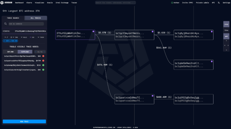 For the first time since 2019, the fifth-largest Bitcoin holding address, also known as “37X,” has transferred more than $6 billion worth of BTC to three new addresses, according to a report.