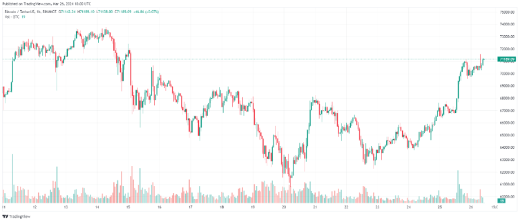 According to CoinMarketCap, Bitcoin increased 6.4% in the twenty-four hours before 9:53 a.m. UTC to $71,222.