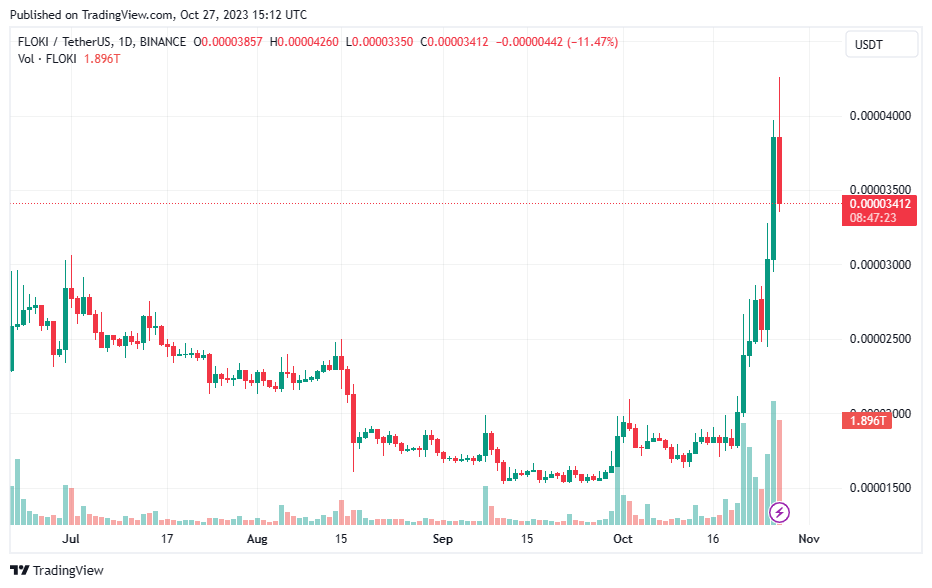 Floki Inu (FLOKI) is one of the best-performing cryptocurrencies today, as it has risen by 25% in the past 24 hours, reaching a high of $0.00003824.